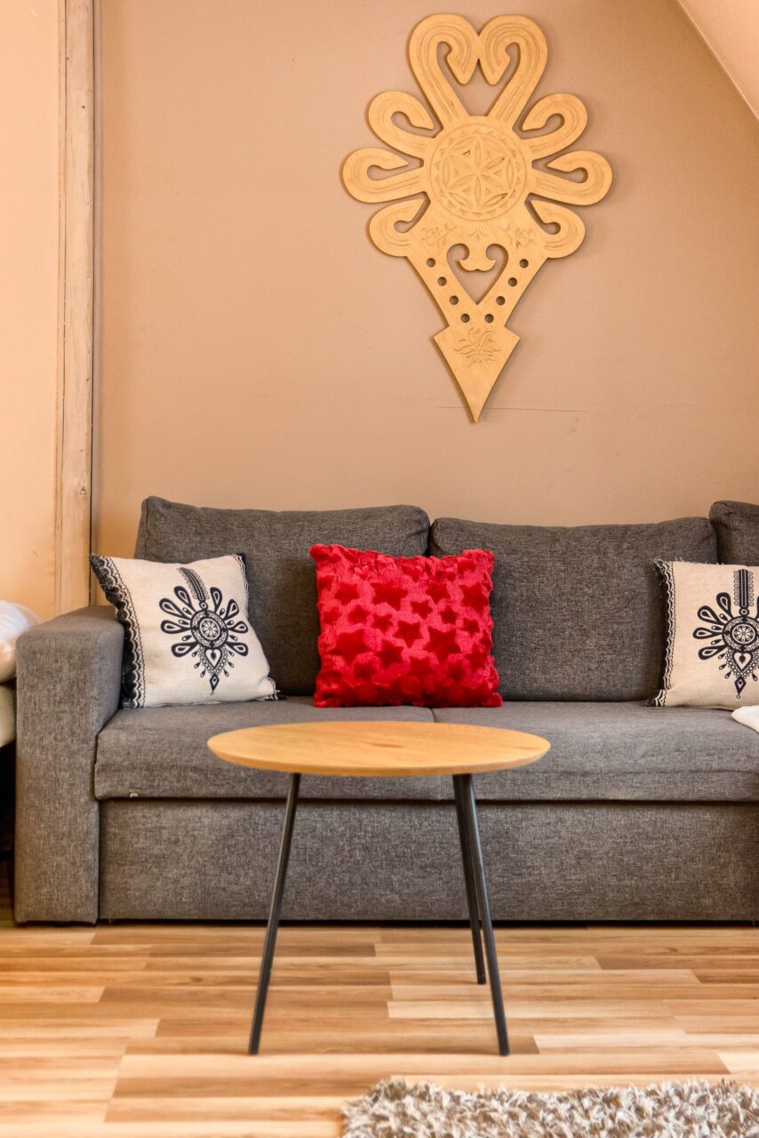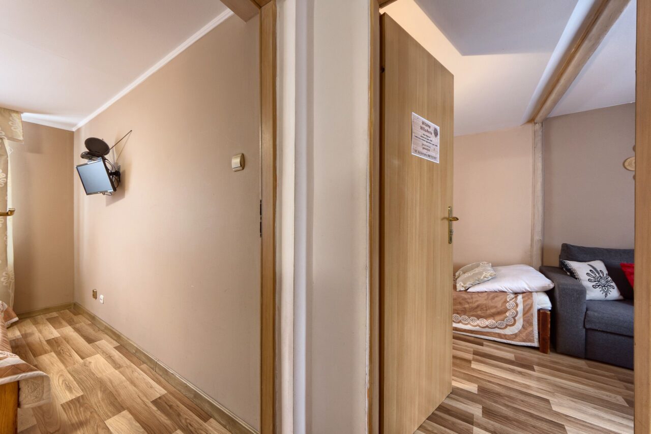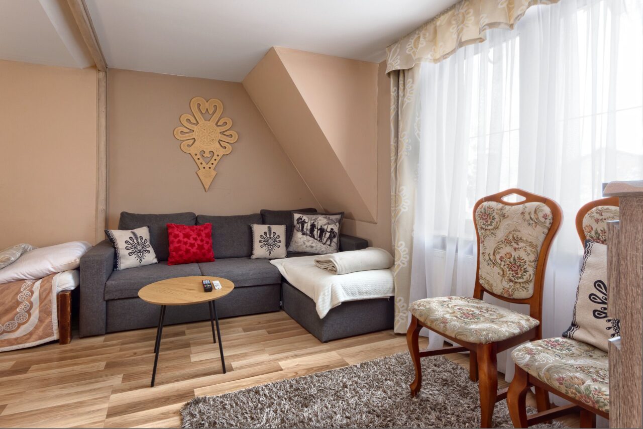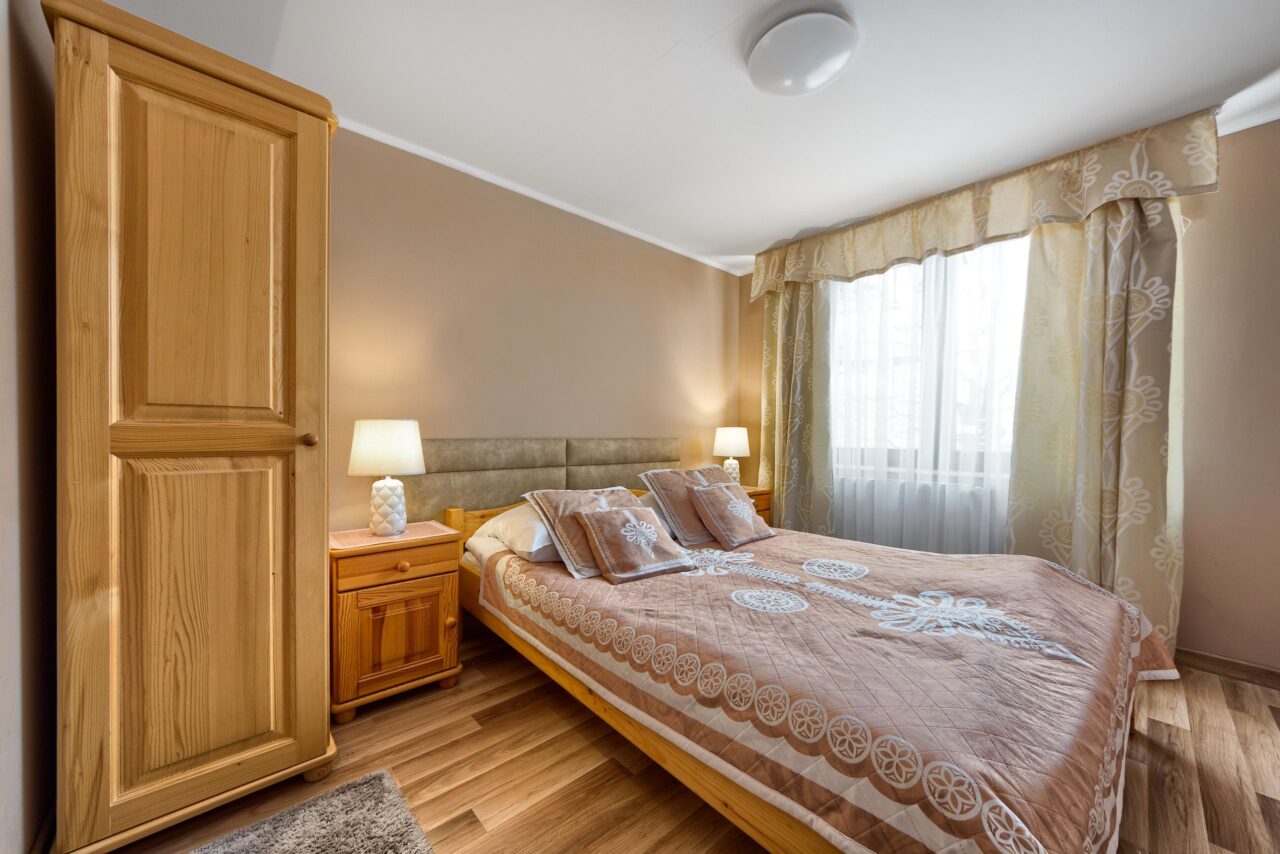 APARTAMENT „5” to apartament o powierzchni 55 m2, przeznaczony dla 5 osób. Apartament składa się z salonu połączonego z kuchnią oraz sypialni i łazienki. W salonie znajduje się rozkładana sofa oraz pojedyncze łóżko 90×200. W pełni wyposażonej kuchni znajduje się stolik z krzesłami. W sypialni znajduje się podwójne łóżko 160×200. W łazience znajdziemy prysznic z toaletą i umywalką. Telewizor zarówno w sypialni jak i salonie.